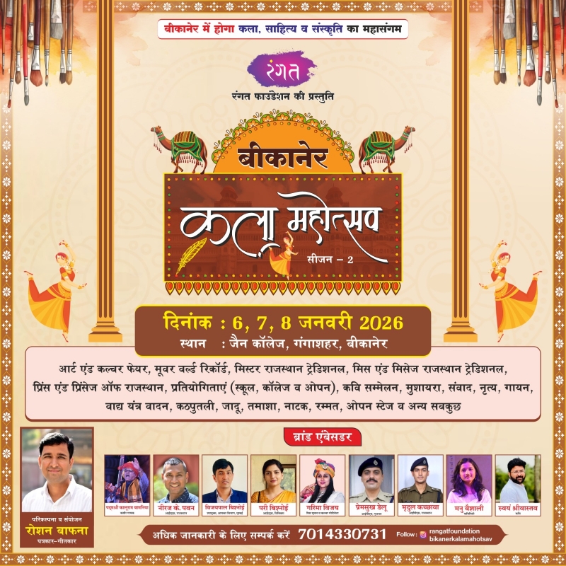 ख़बरमंडी न्यूज़, बीकानेर/राजस्थान।राजस्थान के कला, साहित्य व संस्कृति प्रेमियों के लिए एक बार फिर बीकानेर कला महोत्सव का आयोजन होने जा रहा है। आगामी 6, 7 व 8 जनवरी को बीकानेर कला महोत्सव का सीजन-2 आयोजित होगा। गंगाशहर, बीकानेर के जैन कॉलेज ग्राउंड में आयोजित होने वाले इस महोत्सव के दौरान लगातार तीन दिन सुबह 9 बजे से रात 10 बजे तक कला, साहित्य व संस्कृति के विविध रूप-रंग देखने को मिलेंगे। महोत्सव की परिकल्पना करने वाले संयोजक रोशन बाफना ने बताया कि इन तीन दिनों में राज्य स्तरीय आर्ट एंड कल्चर फेयर सहित स्थानीय व राज्य स्तर की प्रतियोगिताएं तथा स्थानीय व राज्य स्तर के करीब 50 से अधिक कार्यक्रम आयोजित होंगे। रोशन बाफना के अनुसार इस महोत्सव में आर्ट एंड कल्चर फेयर, मिस्टर राजस्थान ट्रेडिशनल 2026, मिस एंड मिसेज राजस्थान ट्रेडिशनल 2026, प्रिंस एंड प्रिंसेज ऑफ राजस्थान 2026, राष्ट्रीय कवि सम्मेलन, स्थानीय कवि सम्मेलन व मुशायरा, राजस्थानी भाषा विशेष कार्यक्रम, भरतनाट्यम, कत्थक, घूमर, चरी नृत्य, लोक नृत्य, मांड गायन, लोक गायन, कबीर वाणी, वाद्ययंत्र वादन, कठपुतली, तमाशा, बहरूपिया, जादू, नाटक, रम्मत, रासलीला, गणगौर, ओपन स्टेज, मूवर वर्ल्ड रिकाॅर्ड, फड़, कावड़, मांडणा, मथेरण, खादी-चरखा, हस्त शिल्प, पुस्तक विमोचन व चर्चा, युवा संवाद सहित स्कूल-काॅलेज व ओपन केटेगरी में लोकनृत्य, लोकगायन, शास्त्रीय संगीत, स्केचिंग, पेटिंग, हैंडीक्राफ्ट, फोटोग्राफी, रील कॉन्टेस्ट, मेंहदी, साफा, पगड़ी, नेल आर्ट, हेयर स्टाइल, मिमिक्री, एक्टिंग, डेकोरेशन आर्ट व झांकी सहित विभिन्न कार्यक्रम व प्रतियोगिताएं आयोजित होंगी। आईएएस नीरज के. पवन, आईएएस परी विश्नोई, आईपीएस प्रेमसुख डेलू, आईपीएस मृदुल कच्छावा, आईआरएस विजयपाल विश्नोई, कल्चर मोटिवेटर व कल्चर आइकन मिस मूमल गरिमा विजय, कवियित्री मनु वैशाली, कवि स्वयं श्रीवास्तव व पद्मश्री कबीर गायक कालूराम बामनिया बीकानेर कला महोत्सव के ब्रांड एंबेसडर हैं। कार्यक्रम में कवि वरुण आनंद, स्वयं श्रीवास्तव, मनु वैशाली, पद्मश्री कबीर गायक कालूराम बामनिया, कल्चर मोटिवेटर मिस मूमल गरिमा विजय सहित देश-प्रदेश विभिन्न कलाकार व कवि प्रस्तुति देंगे।