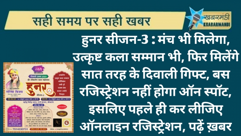 ख़बरमंडी न्यूज़, बीकानेर। हुनरमंदों के चहेते शो हुनर सीजन 3 के मंच पर हुनर दिखाने का उत्साह बीकानेर में भरपूर देखा जा रहा है। ड्राइंग, पेंटिंग, डेकोरेशन आर्ट, मेंहदी, रंगोली, हैंडीक्राफ्ट, मेकअप, नेल आर्ट, हेयर स्टाइल सहित नृत्य, गायन, वादन, मिमिक्री, एक्टिंग, कविता, शायरी, ट्रेडिशनल मॉडलिंग, विचित्र वेशभूषा, स्टोरी टेलिंग, जादू, कॉमेडी, साफा-पगड़ी आदि अनेक तरह के हुनर का प्रदर्शन करने के लिए लोग रजिस्ट्रेशन करवा रहे हैं। हुनर की आयोजक संस्था रंगत फाउंडेशन के संस्थापक रोशन बाफना ने बताया कि इस बार ऑन स्पॉट एंट्री नहीं होगी। अगर आपको अपना हुनर दिखाना है तो अनिवार्य रूप से 12 अक्टूबर तक रजिस्ट्रेशन करवाना होगा। बाफना ने निवेदन किया है कि कोई भी बिना पूर्व रजिस्ट्रेशन प्रतिभागिता हेतु ना आए। हालांकि कार्यक्रम देखने के लिए आ सकते हैं।