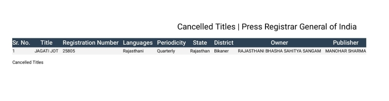 -उल्लेखनीय है कि जागती जोत का शुरुआती रजिस्ट्रेशन 1973 में राजस्थानी भाषा साहित्य संगम के नाम से हुआ, जिसके प्रधान संपादक मनोहर शर्मा थे। बाद में यह किताब अकादमी के अंतर्गत आ गई। जागती जोत के टाइटल रद्द होने की पुष्टि के लिए आप दिए गए लिंक https://prgi.gov.in/our-services/cancelled-data-for-website पर जाकर जागती जोत के कवर पेज़ पर दिए गए आरएनआई रजिस्ट्रेशन नंबर 25805 से सर्च कर सकते हैं। यही नंबर जागती जोत पर अंकित है। लिंक सीधे ना खुलने पर लिंक कॉपी करके गूगल पर सर्च करें।
